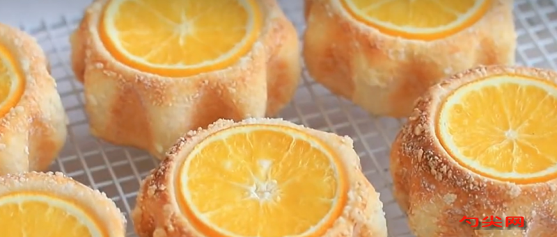工艺:将橙子片煮软,捞出沥干水分备用。酥粒:低筋面粉30g糖粉15g黄油20g搓成酥粒状,冷藏备用。用不完的可冷冻保存。香橙卡仕达酱:蛋黄2个,细砂糖18g,玉米淀粉15g,搅拌混合均匀,混合均匀后加入橙汁70g,佳多美D型0.5g,牛奶120g,混和均匀,过筛倒入不粘锅,小火加入,搅拌至浓稠。关火,加入黄油混合均匀,冷却备用。面团:橙子去皮后,用原汁机榨出橙汁,冷藏备用。除黄油、盐、橙子皮外的所有食材搅拌至厚膜后,加入软化的黄油、盐搅拌至面团光滑,擦入1个橙子皮,搅拌至手套膜,面温24-26度,面团28度一次发酵至2倍大(约60分钟),轻轻按压面团基本不回缩,发酵好的面团平均分成12份(约85g),滚圆,松弛20分钟,面团重新排气、折叠、滚圆,表面喷水,沾上装饰酥粒,放入八角星模具中,面团二次发酵至8分满,放上吸干水分的橙子片,表面放上一张烘焙纸、压一个烤盘。烘烤,上火200度下火230度15分钟(剩余5分钟把烤盘和烘焙纸取走),面包冷却后,挤上香橙卡仕达爆浆奶油。