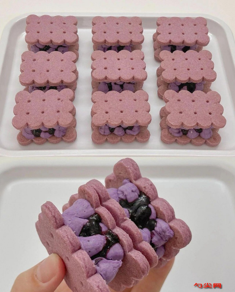 工艺:1.软化的黄油加入糖粉搅匀,加入鸡蛋液搅匀,筛入低筋面粉,泡多源V型和紫薯粉搅拌至无干粉并混合揉成团。2.将面团放在两张油纸中间擀成圆片,冰箱冷冻10分钟,取出后用模具压出形状,摆放在烤盘上,烤箱风炉模式,155度烘烤18分钟左右。3.软化的奶油奶酪加入糖粉打发均匀,加入软化的黄油搅打均匀,加入蓝莓酱搅打均匀,装入裱花袋备用。4.饼干烤好后放凉,饼干背面朝上,挤入蓝莓乳酪,再挤入蓝莓酱,再将两块饼干合二为一即可。