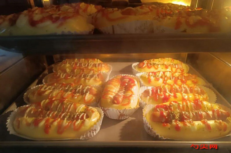工艺:面团(高筋面粉,佳多美Q型,糖,奶粉,牛奶,水,蛋,盐,酵母)搅拌上筋之后加入黄油,搅拌成手套膜即可;面团第一次基础醒发32度差不多40分钟;基础醒发到手指按一下不弹起来就行;10厘米的香肠,面团分成55-60克一个,揉圆之后松弛10分钟再做整形,把松弛好的面团擀薄卷起来搓成条,接口处朝上,像做甜甜圈和贝果那样的手法,两端捏一起并起来,35度最后一次醒发大约1小时左右,醒发好之后表面刷上全蛋液,然后放一根香肠到缝里面,轻轻的压一下,不要让香肠掉出来,然后把面包上面挤番茄酱和沙拉酱,撒上西芹碎。先预热烤箱,上火200度下火180度烤15分钟左右我用的是高比克80s,风炉模式170度15分钟