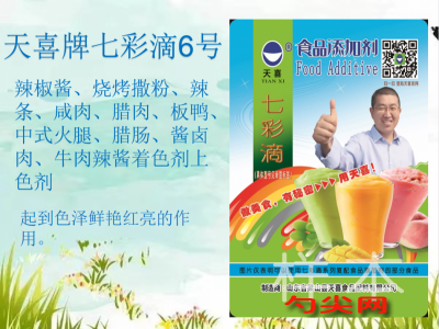 ★商品名:天喜牌七彩滴6型 产品名称:七彩滴牌复配着色剂6 型号:QCD-6 本品按照《食品安全国家标准 食品添加剂使用标准GB2760》及补充规定的品种、应用分类、使用范围、最大使用量、残留量等科学组方,并且按照《食品安全国家标准 复配食品添加剂通则GB26687》精心配制而成。本品已经通过食品生产许可,保障食品安全。用户按照本说明的用法用量生产制作的腌渍的蔬菜(食品分类号:04.02.02.03)、熟制坚果与籽类(仅限油炸坚果与籽类)(食品分类号:04.05.02.01)、糖果(食品分类号:05.02)、方便米面制品(食品分类号:06.07)、粮食制品馅料(食品分类号:06.10)、腌腊肉制品类 (如咸肉、腊肉、板鸭、中式火腿、腊肠)(食品分类号:08.02.02)、熟肉制品(食品分类号:08.03)、调味品(食品分类号:12.01盐及代盐制品除外) (食品分类号:12.0)、膨化食品(食品分类号:16.06)既不会超标也不会超量。