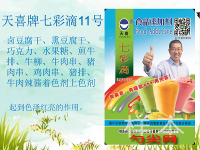 ★商品名:天喜牌七彩滴11号 产品名称:七彩滴牌复配着色剂7 型号:QCD-11 本品按照《食品安全国家标准 食品添加剂使用标准GB2760》及补充规定的品种、应用分类、使用范围、最大使用量、残留量等科学组方,并且按照《食品安全国家标准 复配食品添加剂通则GB26687》精心配制而成。本品已经通过食品生产许可,保障食品安全。用户按照本说明的用法用量生产制作的豆干再制品(食品分类号:04.04.01.03)、可可制品、巧克力和巧克力制品, 包括代可可脂巧克力及制品(食品分类号:05.01)、糖果(食品分类号:05.02)、面糊(如用于鱼和禽肉的拖面糊)、裹粉、煎炸粉(食品分类号:06.03.02.04)、调理肉制品(生肉添加调理料) (食品分类号:08.02.01)、酱及酱制品(食品分类号:12.05)、复合调味料(食品分类号:12.10)既不会超标也不会超量。