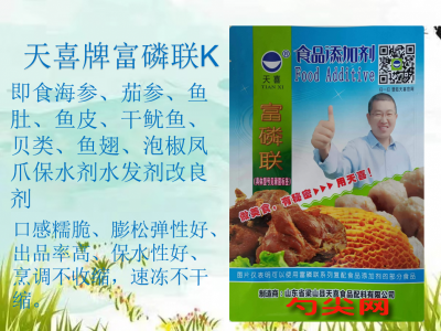 〔富磷联K型〕用于海参、鲍鱼干等冷冻水产品、熟制水产品 、预制肉制品、熟肉制品,还可以起到水分保持、膨松、酸度调节、保型等作用。