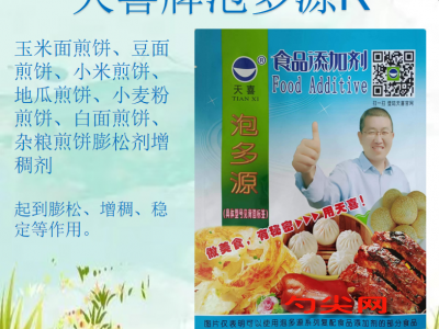 ★功能作用:〔泡多源R型 〕用于玉米面煎饼、豆面煎饼、小米煎饼、地瓜煎饼、小麦粉煎饼、白面煎饼、杂粮煎饼、裹粉、面糊、酥条、薄脆、薄烧饼、炸丸子等各类烘焙看、油炸食品,起到膨松、增稠、稳定等作用。用于煎饼、薄脆、薄烧饼还可以减少破碎率,防止折叠断裂等作用。