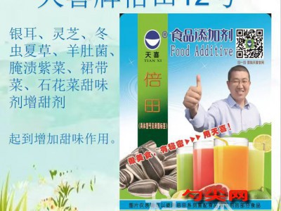 ★商品名:天喜牌倍田12型 产品名称:倍田牌复配甜味剂12 型号:BT-12 本品按照《食品安全国家标准 食品添加剂使用标准GB2760》及补充规定的品种、应用分类、使用范围、最大使用量、残留量等科学组方,并且按照《食品安全国家标准 复配食品添加剂通则GB26687》精心配制而成。本品已经通过食品生产许可,保障食品安全。用户按照本说明的用法用量生产制作的腌渍的食用菌和藻类(食品分类号:04.03.02.03)既不会超标也不会超量。