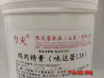 ★商品名:味达蕾13# 产品名称:鸡肉精膏香精 本品按照《食品安全国家标准 食品添加剂使用标准GB2760》及补充规定的品种、应用分类、使用范围、最大使用量、残留量等科学组方,并且按照《食品安全国家标准 食品用香精GB30616-2014》精心配制而成。本品已经通过食品生产许可,保障食品安全。