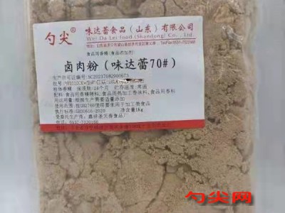 ★商品名:味达蕾70# 产品名称:卤肉粉 本品按照《食品安全国家标准 食品添加剂使用标准GB2760》及补充规定的品种、应用分类、使用范围、最大使用量、残留量等科学组方,并且按照《食品安全国家标准 食品用香精GB 30616-2014》精心配制而成。本品已经通过食品生产许可,保障食品安全。