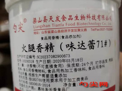 ★商品名:味达蕾71# 产品名称:火腿香精 本品是由味达蕾食品(山东)有限公司委托有资质的正规企业生产,本品按照《食品安全国家标准 食品添加剂使用标准GB2760》及补充规定的品种、应用分类、使用范围、最大使用量、残留量等科学组方,并且按照《食品安全国家标准 食品用香精GB30616-2014》精心配制而成。本品已经通过食品生产许可,保障食品安全。