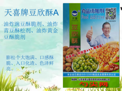 ★商品名:天喜牌豆欣酥A型 产品名称:豆欣酥牌复配酶制膨松剂2 型号:DXS-A 本品完全按照《食品安全国家标准 食品添加剂使用标准GB2760》及补充规定的品种、应用分类、使用范围、最大使用量、残留量等科学组方,并且按照《食品安全国家标准 复配食品添加剂通则GB26687》精心配制而成。本品已经通过食品生产许可,保障食品安全。用户按照本说明的用法用量生产制作的面糊(如用于鱼和禽肉的拖面糊)、裹粉、煎炸粉(食品分类号:06.11)、膨化食品(食品分类号:16.06)、熟制坚果与籽类(仅限油炸坚果与籽类)(食品分类号:04.05.02.01)既不会超标也不会超量。