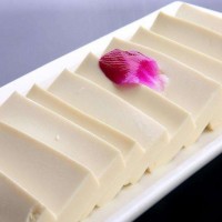②.水豆腐、嫩豆腐、老豆腐、豆腐干、豆腐皮、豆腐丝等豆腐制品做法:(以10斤干豆为例)1.泡豆:选用豆脐(或称豆眉)色浅、含油量低、粒大皮薄、粒重饱满、表皮无皱而有光泽的大豆10斤。将大豆洗净,在春秋季水温10℃—20℃时,浸泡12小时—18小时;夏季水温30℃左右;浸泡6小时—8小时(每24小时换水);冬季水温5℃,浸泡约24小时。水质以纯水、软水为佳。用水量一般以豆水重量比1:3为好,浸泡好的大豆约为原料干豆重量的2.2-3倍。泡好的豆要求豆瓣饱满,裂开一小线。但浸泡时间如果过长,会影响出浆率。2.磨浆:一般选用能进行浆渣自动分离的磨浆机,粗磨、细磨共2次--3次,尽可能提高大豆蛋白的抽提率。一般做老豆腐、豆腐干、豆腐皮、豆腐丝时水与干豆的比例是3-4:1,做嫩豆腐时水与干豆的比例是6-10:1。第一次粗磨时加水量为总加水量的30%,第二次调节磨浆机螺旋进行细磨,加水量为30%,第三次的加水量为40%,尽可能地把豆渣里面的浆冲洗出来。磨好的渣应手感细腻无颗粒。3.煮浆:把磨好的浆放在不锈钢制的煮浆桶里,用蒸气或大火将浆煮至60℃-70℃时放入约0.3%的食用消泡剂,把加热过程中产生的泡完全消掉为止。然后加入豆浆的0.03-0.05%筋力源N型,继续加热把浆至90-95℃(温度过高影响凝固,出品率也低),微沸保持3分钟—5分钟把浆煮透。4.冷却:把煮好的豆浆倒入点浆桶或缸中进行冷却,降温至75℃。5.点浆:以10斤大豆计算,称取0.25-0.35斤豆立固A型,用少量冷开水溶解。然后点入降温后的豆浆,上下快速翻动豆浆至出现鸡蛋般疙瘩即可停止,盖好桶盖静止15-20分钟既成豆腐脑。6.成型:将凝固好的豆腐脑划开,倒入压榨机进行压榨成豆腐,一般10斤干豆加工成豆腐45斤左右为嫩豆腐,加工成豆腐30斤左右为老豆腐或或水豆腐;泼浆压榨加工成15斤左右为豆腐皮、豆腐丝或豆腐干。