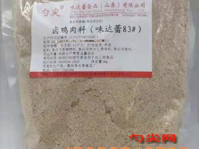 ★商品名:味达蕾83# 产品名称:卤鸡肉料 本品按照《食品安全国家标准 食品添加剂使用标准GB2760》及补充规定的品种、应用分类、使用范围、最大使用量、残留量等科学组方,并且按照《食品安全国家标准 食品用香精GB30616-2014》精心配制而成。本品已经通过食品生产许可,保障食品安全。