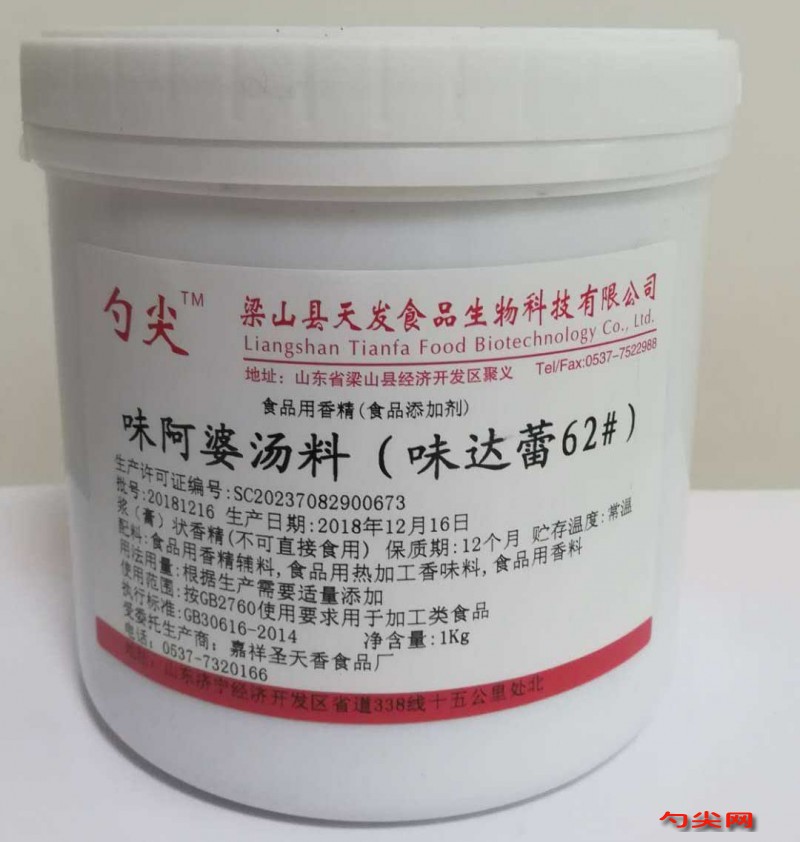 ★商品名:味达蕾62# 产品名称:味阿婆汤料 本品完全按照《食品安全国家标准 食品添加剂使用标准GB2760》及补充规定的品种、应用分类、使用范围、最大使用量、残留量等科学组方,并且按照《食品安全国家标准 食品用香精GB 30616-2014》精心配制而成。本品已经通过食品生产许可,保障食品安全。