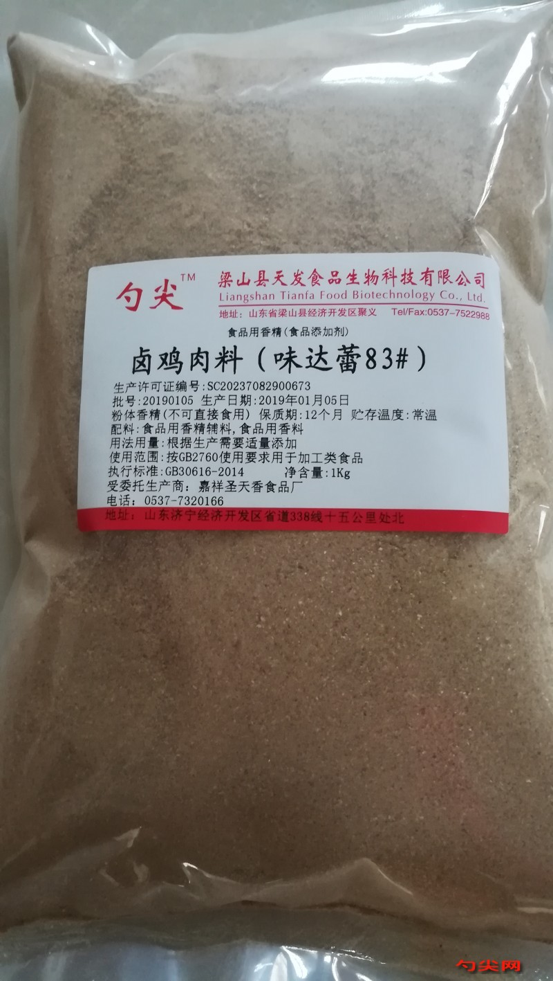 ★商品名:味达蕾83# 产品名称:卤鸡肉料 型号: 本品完全按照《食品安全国家标准 食品添加剂使用标准GB2760》及补充规定的品种、应用分类、使用范围、最大使用量、残留量等科学组方,并且按照《食品安全国家标准 食品用香精GB 30616-2014》精心配制而成。本品已经通过食品生产许可,保障食品安全。用户按照本说明的用法用量生产制作的预制肉制品(食品分类号:08.02)、熟肉制品(食品分类号:08.03)、复合调味料(食品分类号:12.10)既不会超标也不会超量。