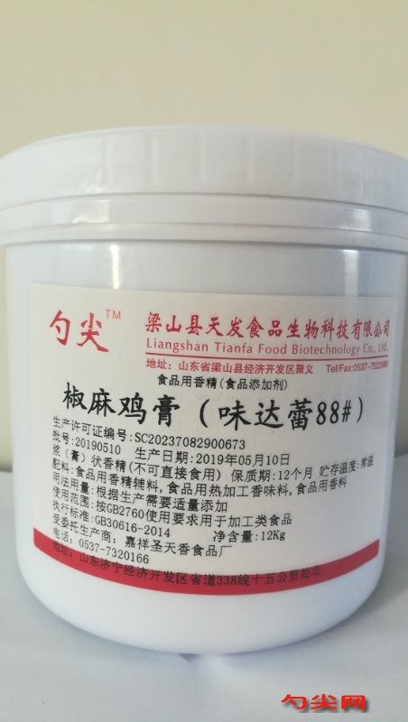 ★商品名:味达蕾88# 产品名称:椒麻鸡膏 型号: 本品完全按照《食品安全国家标准 食品添加剂使用标准GB2760》及补充规定的品种、应用分类、使用范围、最大使用量、残留量等科学组方,并且按照《食品安全国家标准 食品用香精GB30616-2014》精心配制而成。本品已经通过食品生产许可,保障食品安全。用户按照本说明的用法用量生产制作的各类食品既不会超标也不会超量。