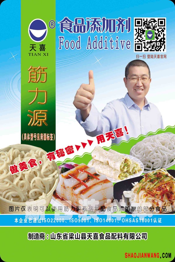 ★商品名:天喜牌筋力源Z型 产品名称:筋力源牌复配酸度调节剂 型号:JLY-Z 本品完全按照《食品安全国家标准 食品添加剂使用标准GB2760》及补充规定的品种、应用分类、使用范围、最大使用量、残留量等科学组方,并且按照《食品安全国家标准 复配食品添加剂通则GB26687》精心配制而成。本品已经通过食品生产许可,保障食品安全。用户按照本说明的用法用量生产制作的豆类制品(食品分类号:04.04)、发酵面制品(食品分类号:06.03.02.03)、其他(食品分类号:16.07)既不会超标也不会超量。★配料表:黄原胶、碳酸钠、微晶纤维素。
