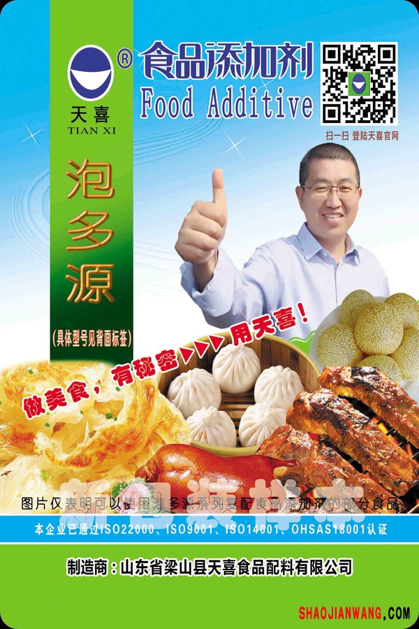 ★商品名:天喜牌泡多源D型 产品名称:泡多源牌复配发酵面制品乳化膨松剂 型号:PDY-D 本品完全按照《食品安全国家标准 食品添加剂使用标准GB2760》及补充规定的品种、应用分类、使用范围、最大使用量、残留量等科学组方,并且按照《食品安全国家标准 复配食品添加剂通则GB26687》精心配制而成。本品已经通过食品生产许可,保障食品安全。用户按照本说明的用法用量生产制作的发酵面制品(食品分类号:06.03.02.03)、焙烤食品(食品分类号:07.0)既不会超标也不会超量。★配料表:D-异抗坏血酸钠、碳酸氢钠、葡萄糖酸-δ-内酯、焦磷酸二氢二钠、单双甘油脂肪酸酯、酒石酸氢钾、α-淀粉酶、食用玉米淀粉。