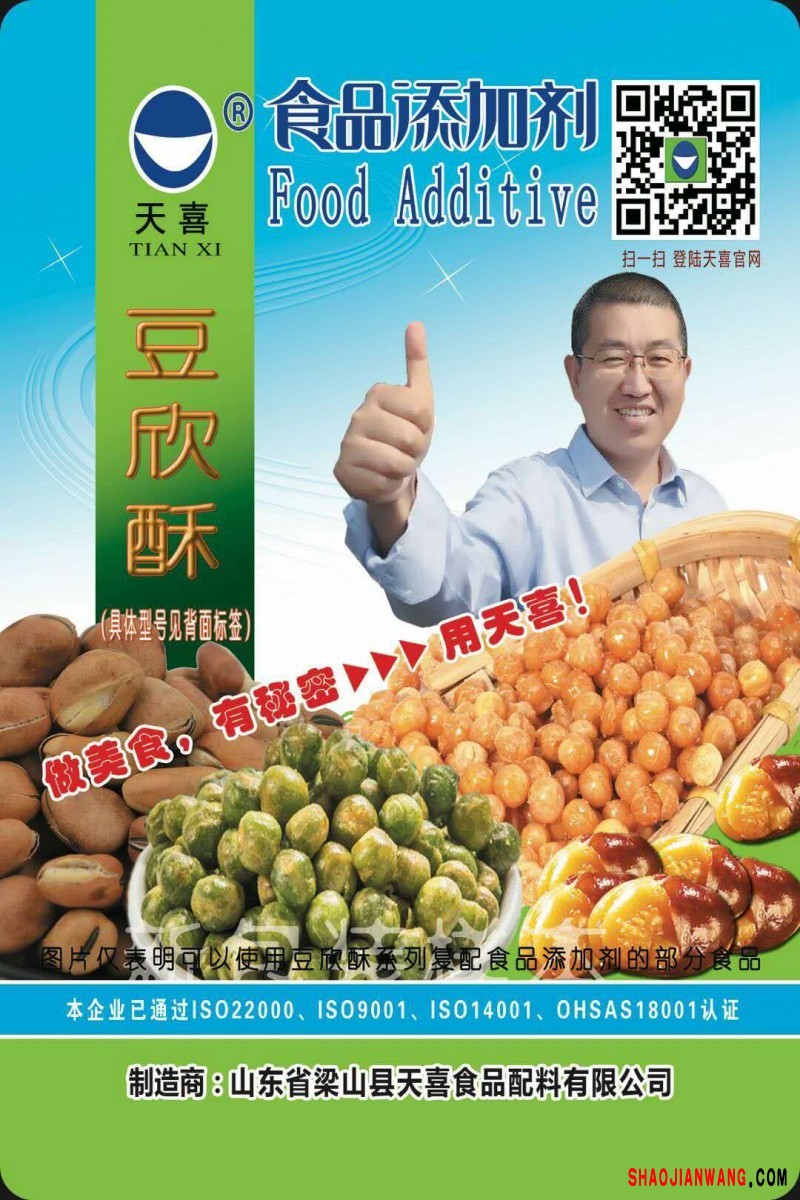 ①.焙烤炒蚕豆做法:蚕豆100斤(以云南蚕豆品种最好,焙烤炒制比较酥脆,其他品种可能不酥脆,而且很容易发黑)、凉水250斤、豆欣酥C型1.2-1.5斤、栀子黄0.03-0.08斤(根据各地颜色要求不同,可以不加)。工艺:先将豆欣酥C型用凉水溶解后(溶解时要不停搅拌,先把溶解好的慢慢倒出来,如果还有没溶解的沉淀物,再加点水继续搅拌溶解,直到完全溶解)加入250斤净水中搅匀,再加入栀子黄搅拌溶解,然后放入蚕豆100斤再次搅拌一下。静止浸泡2-5天(夏天浸泡2个天,春秋天浸泡3天,冬天浸泡5天。浸泡时间越长越好,但不能发芽变质,可以放入空调或冷库浸泡)。捞出后清洗一遍、沥干表面水分,入锅炒至金黄酥脆即可(或送入烤箱、烤炉、炒炉),一定炒或烤干水分(如果炒不干水分,很快就会返潮发哏、不酥)。趁热调味,并彻底降温后密封包装销售。