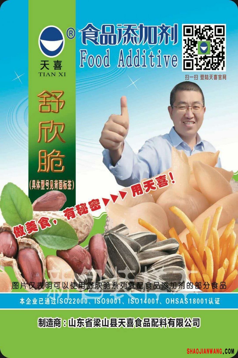 ★商品名:天喜牌舒欣脆A型 产品名称:舒欣脆牌复配加工坚果与籽类稳定膨松剂 型号:SXC-A 本品完全按照《食品安全国家标准 食品添加剂使用标准GB2760》及补充规定的品种、应用分类、使用范围、最大使用量、残留量等科学组方,并且按照《食品安全国家标准 复配食品添加剂通则GB26687》精心配制而成。本品已经通过食品生产许可,保障食品安全。用户按照本说明的用法用量生产制作的加工坚果与籽类(食品分类号:04.05.02)既不会超标也不会超量。★配料表:葡萄糖酸-δ-内酯、D-异抗坏血酸钠、柠檬酸钠、碳酸氢钠、食用玉米淀粉。