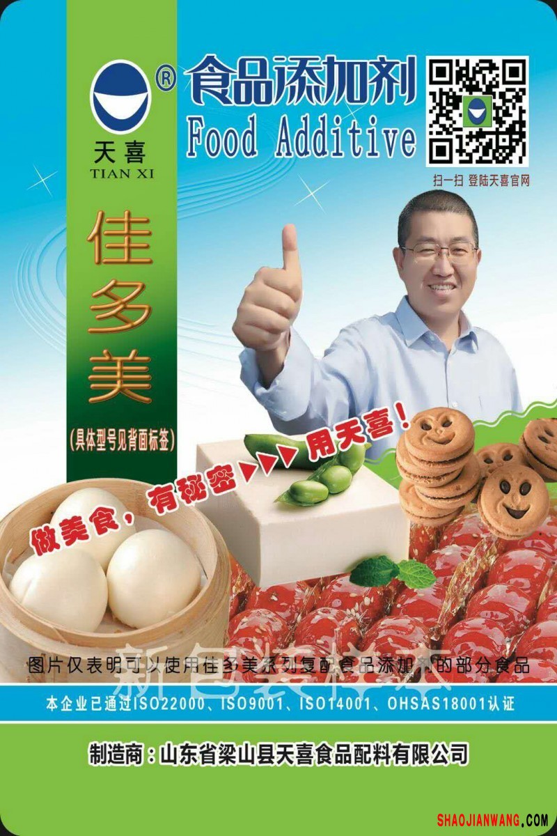 ★商品名:天喜牌佳多美L型 产品名称:佳多美牌复配乳化剂 型号:JDM-L 本品完全按照《食品安全国家标准 食品添加剂使用标准GB2760》及补充规定的品种、应用分类、使用范围、最大使用量、残留量等科学组方,并且按照《食品安全国家标准 复配食品添加剂通则GB26687》精心配制而成。本品已经通过食品生产许可,保障食品安全。用户按照本说明的用法用量生产制作的专用小麦粉(食品分类号:06.03.01.02)、生湿面制品(食品分类号:06.03.02.01)、面包(食品分类号:07.01)、糕点(食品分类号:07.02)、饼干(食品分类号:07.03)既不会超标也不会超量。★配料表:蔗糖脂肪酸酯、硬脂酰乳酸钙、谷氨酰胺转氨酶、谷朊粉。