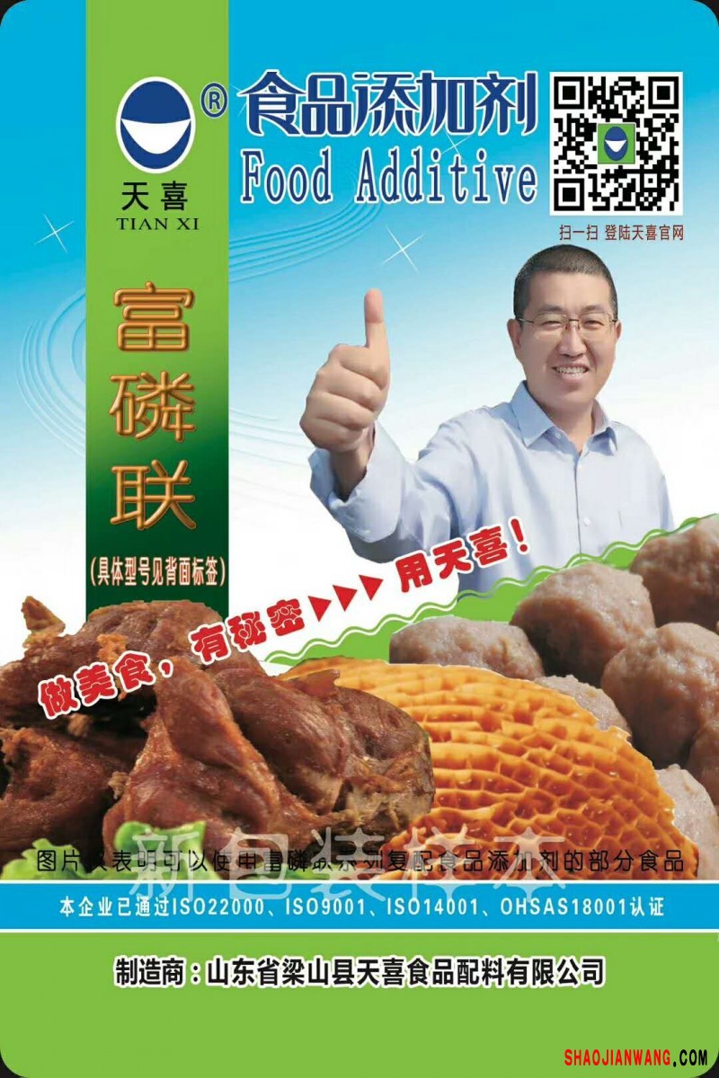 ★商品名:天喜牌富磷联B型 产品名称:富磷联牌复配熟制肉制品水分保持剂 型号:FLL-B 本品完全按照《食品安全国家标准 食品添加剂使用标准GB2760》及补充规定的品种、应用分类、使用范围、最大使用量、残留量等科学组方,并且按照《食品安全国家标准 复配食品添加剂通则GB26687》精心配制而成。本品已经通过食品生产许可,保障食品安全。用户按照本说明的用法用量生产制作的熟制肉制品(食品分类号:08.03)、预制肉制品(食品分类号:08.02)、冷冻鱼糜制品(食品分类号:09.02.03)既不会超标也不会超量。★配料表:六偏磷酸钠、焦磷酸钠、三聚磷酸钠、磷酸氢二钠、谷胺酰转氨酶、D-异抗坏血酸钠、食用玉米淀粉。