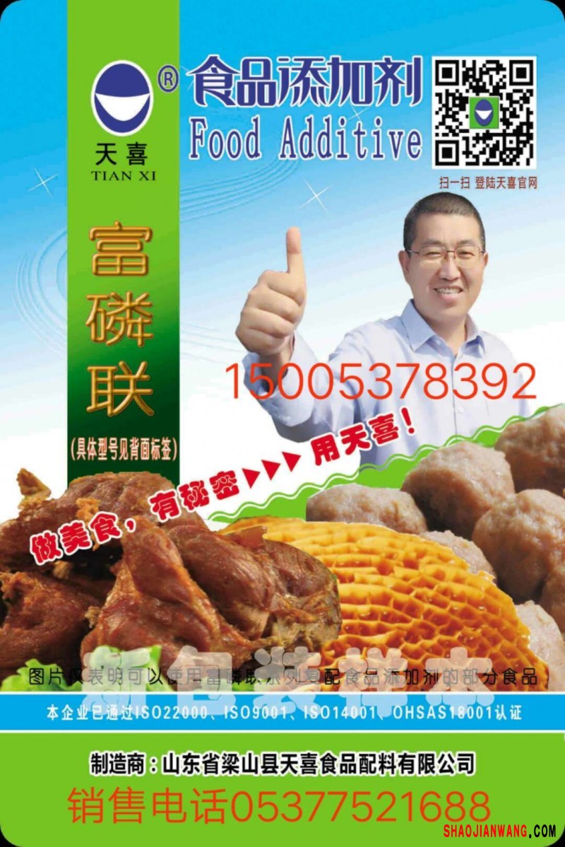 ★商品名:天喜牌富磷联B型 产品名称:富磷联牌复配熟制肉制品水分保持剂 型号:FLL-B 本品完全按照《食品安全国家标准 食品添加剂使用标准GB2760》及补充规定的品种、应用分类、使用范围、最大使用量、残留量等科学组方,并且按照《食品安全国家标准 复配食品添加剂通则GB26687》精心配制而成。本品已经通过食品生产许可,保障食品安全。用户按照本说明的用法用量生产制作的熟制肉制品(食品分类号:08.03)、预制肉制品(食品分类号:08.02)、冷冻鱼糜制品(食品分类号:09.02.03)既不会超标也不会超量。