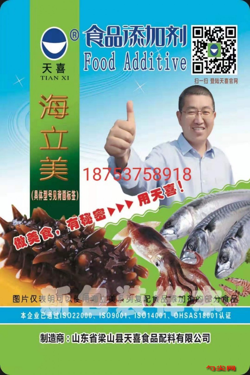 ★商品名:天喜牌海立美A型 产品名称:海立美牌复配熟制水产品水分保持膨松剂 型号:HLM-A 本品完全按照《食品安全国家标准 食品添加剂使用标准GB2760》及补充规定的品种、应用分类、使用范围、最大使用量、残留量等科学组方,并且按照《食品安全国家标准 复配食品添加剂通则GB26687》精心配制而成。本品已经通过食品生产许可,保障食品安全。用户按照本说明的用法用量生产制作的熟制水产品(食品分类号:09.04)、预制肉制品(食品分类号:08.02)、熟肉制品(食品分类号:08.03)既不会超标也不会超量。