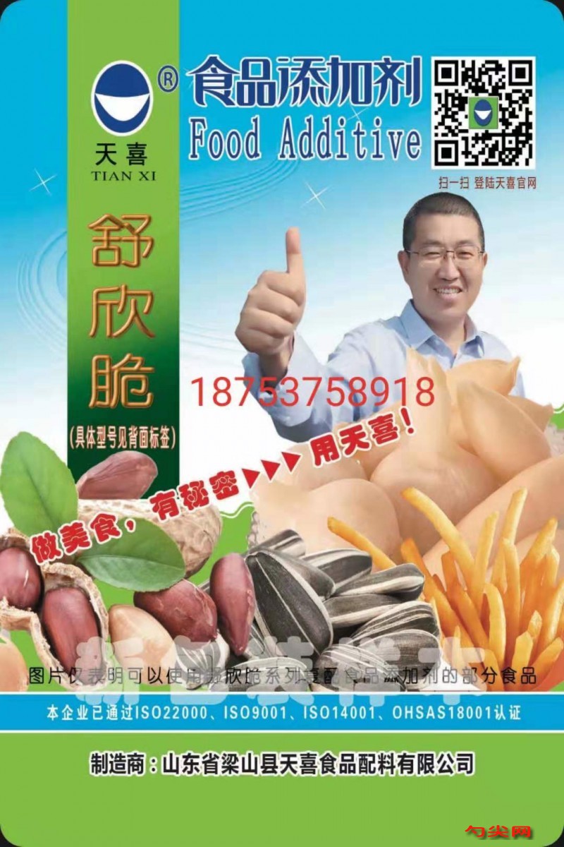 ★商品名:天喜牌舒欣脆F型 产品名称:舒欣脆牌复配酶制膨松剂 型号:SXC-F 本品完全按照《食品安全国家标准 食品添加剂使用标准GB2760》及补充规定的品种、应用分类、使用范围、最大使用量、残留量等科学组方,并且按照《食品安全国家标准 复配食品添加剂通则GB26687》精心配制而成。本品已经通过食品生产许可,保障食品安全。用户按照本说明的用法用量生产制作的杂粮制品(食品分类号:06.04.02)、膨化食品(食品分类号:16.06)既不会超标也不会超量。
