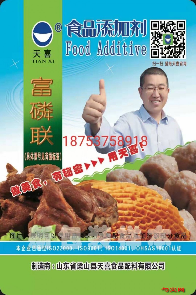 ★商品名:天喜牌富磷联A型 产品名称:富磷联牌复配熟制肉制品水分保持膨松剂 型号:FLL-A 本品完全按照《食品安全国家标准 食品添加剂使用标准GB2760》及补充规定的品种、应用分类、使用范围、最大使用量、残留量等科学组方,并且按照《食品安全国家标准 复配食品添加剂通则GB26687》精心配制而成。本品已经通过食品生产许可,保障食品安全。用户按照本说明的用法用量生产制作的熟制肉制品(食品分类号:08.03)、预制肉制品(食品分类号:08.02)既不会超标也不会超量。