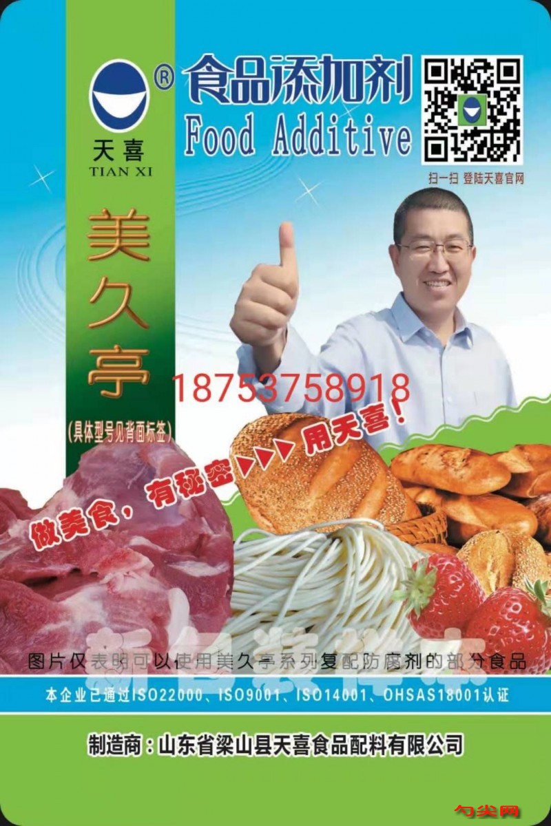 ★商品名:天喜牌美久亭A 产品名称:美久亭复配防腐剂1 型号:MJT-A 本品完全按照《食品安全国家标准 食品添加剂使用标准GB2760》及补充规定的品种、应用分类、使用范围、最大使用量、残留量等科学组方,并且按照《食品安全国家标准 复配食品添加剂通则GB26687》精心配制而成。本品已经通过食品生产许可,保障食品安全。用户按照本说明的用法用量生产制作的预制肉制品(食品分类号:08.02)、熟肉制品(食品分类号:08.03)、复合调味料(食品分类号:12.10)既不会超标也不会超量。