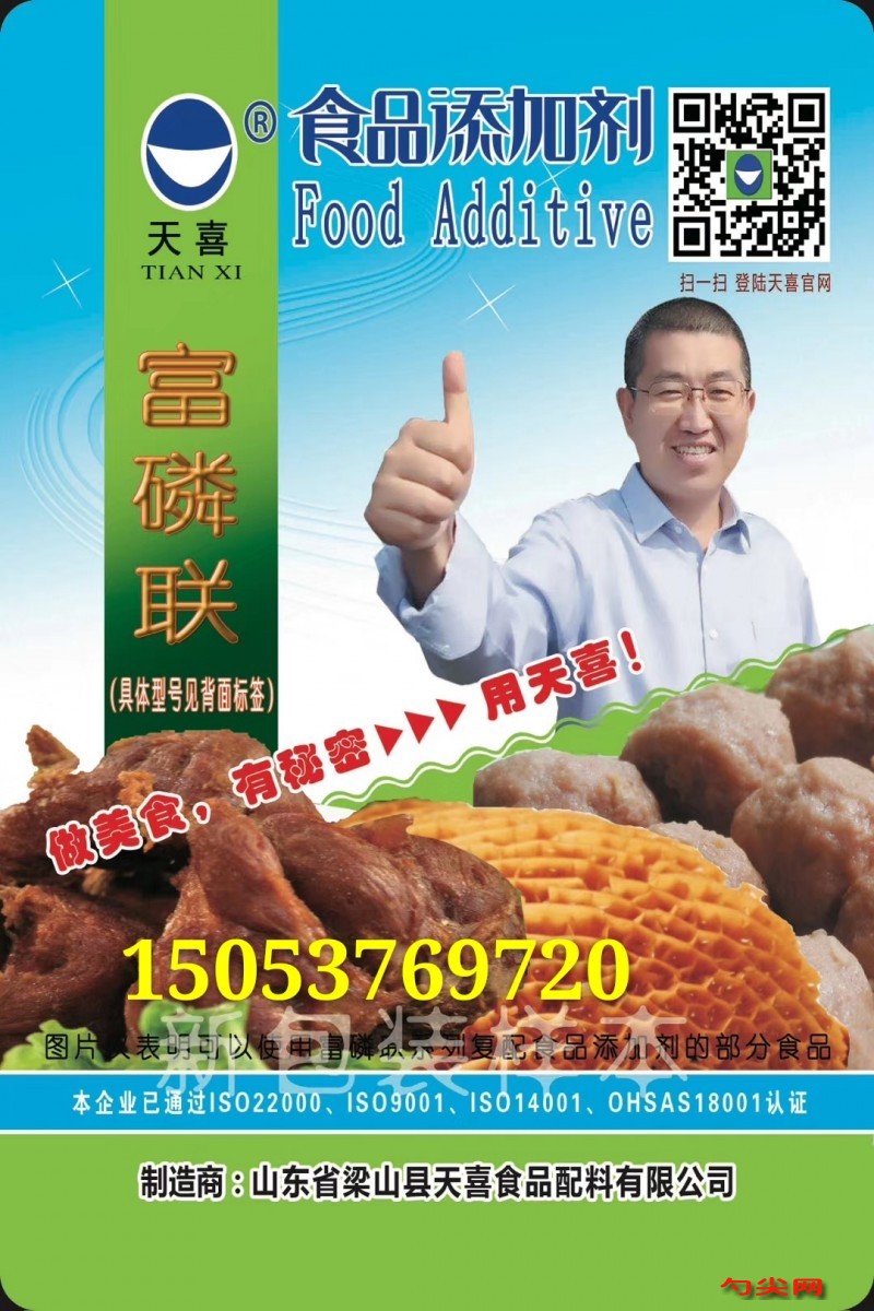 ★商品名:天喜牌富磷联B型 产品名称:富磷联牌复配熟制肉制品水分保持剂 型号:FLL-B 本品完全按照《食品安全国家标准 食品添加剂使用标准GB2760》及补充规定的品种、应用分类、使用范围、最大使用量、残留量等科学组方,并且按照《食品安全国家标准 复配食品添加剂通则GB26687》精心配制而成。本品已经通过食品生产许可,保障食品安全。用户按照本说明的用法用量生产制作的熟制肉制品(食品分类号:08.03)、预制肉制品(食品分类号:08.02)、冷冻鱼糜制品(食品分类号:09.02.03)既不会超标也不会超量。