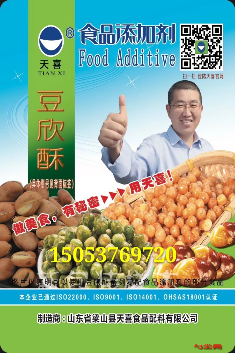 ★商品名:天喜牌豆欣酥A型 产品名称:豆欣酥牌复配熟制坚果与籽类酶制膨松剂 型号:DXS-A 本品完全按照《食品安全国家标准 食品添加剂使用标准GB2760》及补充规定的品种、应用分类、使用范围、最大使用量、残留量等科学组方,并且按照《食品安全国家标准 复配食品添加剂通则GB26687》精心配制而成。本品已经通过食品生产许可,保障食品安全。用户按照本说明的用法用量生产制作的熟制坚果与籽类(仅限油炸坚果与籽类)(食品分类号:04.05.02.01)既不会超标也不会超量。