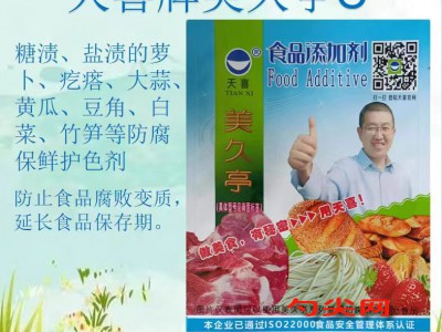 ★功能作用:〔美久亭C〕用于糖渍、盐渍的萝卜、疙瘩、大蒜、黄瓜、豆角、白菜、竹笋等各类蔬菜,可以调节食品PH值,有效抑制食品中微生物的繁殖,防止或延缓食品成分氧化、分解变质,防止食品腐败变质,延长食品保存期,起到防腐保鲜作用。〔美久亭C〕同时具有一定的护色作用。 〔美久亭C型〕还可用于竹笋腌制、腌萝卜、爽脆萝卜条、腌洋姜、辣白菜、腌疙瘩咸菜、腌雪菜、腌青辣椒、腌红辣椒、酱腌黄瓜、酱八宝菜等,起到防腐保鲜作用。