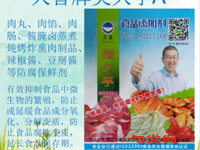 功能作用:〔美久亭A型〕用于酱腌卤蒸煮炖烤炸熏肉制品等熟制肉制品,以及辣椒酱、沙拉酱、蛋黄酱、咖喱膏、牛肉酱、猪肉酱、番茄沙司、西瓜酱、豆掰酱等固体调味料、半固体调味料、液体调味料、复合调味料,可以调节食品PH值,有效抑制食品中微生物的繁殖,防止或延缓食品成分氧化、分解变质,防止食品腐败变质,延长食品保存期,起到防腐保鲜作用。〔美久亭A型〕还可用于肉粉肠、卤猪蹄、无磷卤鸡爪、油炸萝卜肉丸子、香菇牛肉酱、无磷小酥肉、猪皮冻、油炸大酥肉、四喜丸子、豆渣鸡肉酱、豆渣猪肉酱、炖猪蹄、午餐肉、猪肉肠、蒸水晶猪皮冻、卤猪皮卷、番茄酱、腐竹腐皮肉卷、腊肉肠、脆皮肠、玉米脆皮肠、坛子鸡、荷叶叫花鸡、香草竹笼鸡、卤鸭舌、五香烧鸡、麻辣鸭翅、卤鸭锁骨、卤羊蹄、酱卤鸭翅根、肉粉肠、卤猪脸肉、五香卤鸭腿、麻辣鸭肠、五香酱肘子、速冻猪肉小酥肉、速冻鸡肉小酥肉、卤鸭掌、卤鸭胗、卤猪舌、卤猪尾巴、卤猪心、烤猪脆骨、蔬菜皮冻肠、盐水鸭、卤猪头、卤酱香猪耳朵、水晶肴肉、水晶猪头肉焖子、油皮卷煎、熏肉卷、松花鸡腿、麻辣鸭头、黄豆猪蹄、炸鸡架、油炸鸡叉骨、卤猪耳、柠檬无骨鸡爪、猪肝炖煮、卤鸽子、油炸鸽子、卤猪肘、卤鸭脖、泡椒猪皮、泡椒凤爪、卤鸡爪、猪肉脯、牛肉香辣酱、雪花重组肉、雪花鸡排、烤鸽子、水发卤制鸡胗、水发猪大肠、红烧驴肉、青辣椒酱、油炸鸡排、五香酱卤牛肉、香辣肉酱、牛肉丸、羊肉丸、猪肉丸、鸡肉丸、猪排重组肉、鸡肉玉米香肠、猪肉香肠、烤鸭、烤肠、烧鸡、粉肚、红烧狮子头、鱼肉丸、速冻虾丸、鸡肉肠、猪肉肠、哈尔滨红肠、脱骨烧鸡、酱牛肉、卤新鲜牛肚、卤牛蹄等熟肉制品、复合调味料,起到防腐保鲜作用。