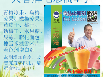 ★商品名:天喜牌七彩滴4型 产品名称:七彩滴牌复配稳定着色剂4 型号:QCD-4 本品按照《食品安全国家标准 食品添加剂使用标准GB2760》及补充规定的品种、应用分类、使用范围、最大使用量、残留量等科学组方,并且按照《食品安全国家标准 复配食品添加剂通则GB26687》精心配制而成。本品已经通过食品生产许可,保障食品安全。用户按照本说明的用法用量生产制作的凉果类(食品分类号:04.01.02.08.02)、话化类(食品分类号:04.01.02.08.04)、熟制坚果与籽类(仅限油炸坚果与籽类)(食品分类号:04.05.02.01)、除胶基糖果以外的其他糖果(食品分类号:05.02.02)、果冻(食品分类号:16.01)、膨化食品(食品分类号:16.06)既不会超标也不会超量。
